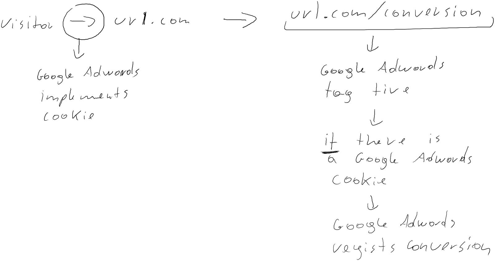 The visitor visits a url from an Adwords campaign and the system will implement a cookie saying that that visitor came from an Adwords campaign. Later if that user visits apage or triggers a Google Adwords conversion tag, then the tag will search for the Adwords cookie and if the cookie is there, then it will attribute that conversion to that cookie’s campaign.